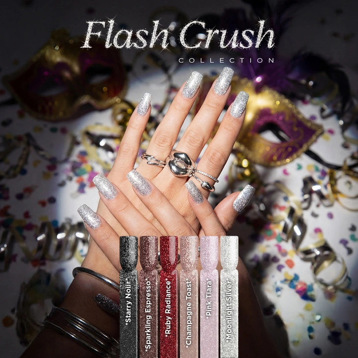 Jeśli zależy Ci na lakierach hybrydowych, które dają efekt „wow” w świetle, a jednocześnie pozwalają na komfortową aplikację, Flash Crush będzie świetnym wyborem. Refleksyjne pigmenty budują wrażenie głębi, a błyszczące mikrodrobinki podkreślają kształt paznokci i dodają stylizacji elegancji. Kolekcja sprawdzi się zarówno przy jednokolorowym manicure, jak i jako baza do prostych zdobień.