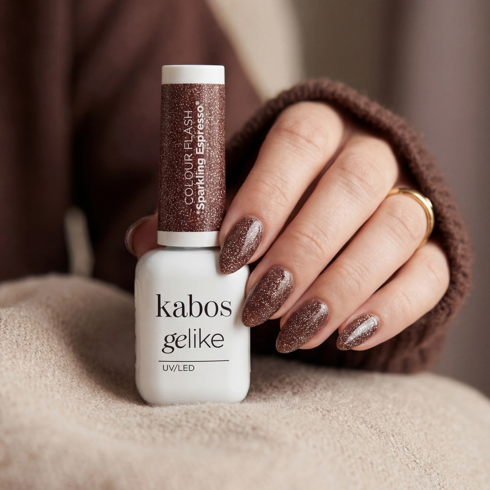 Gelike Flash Sparkling Espresso łączy w sobie klasykę, głębię koloru i delikatny blask, tworząc stylizację, która wygląda świeżo, elegancko i wyjątkowo przez wiele dni.