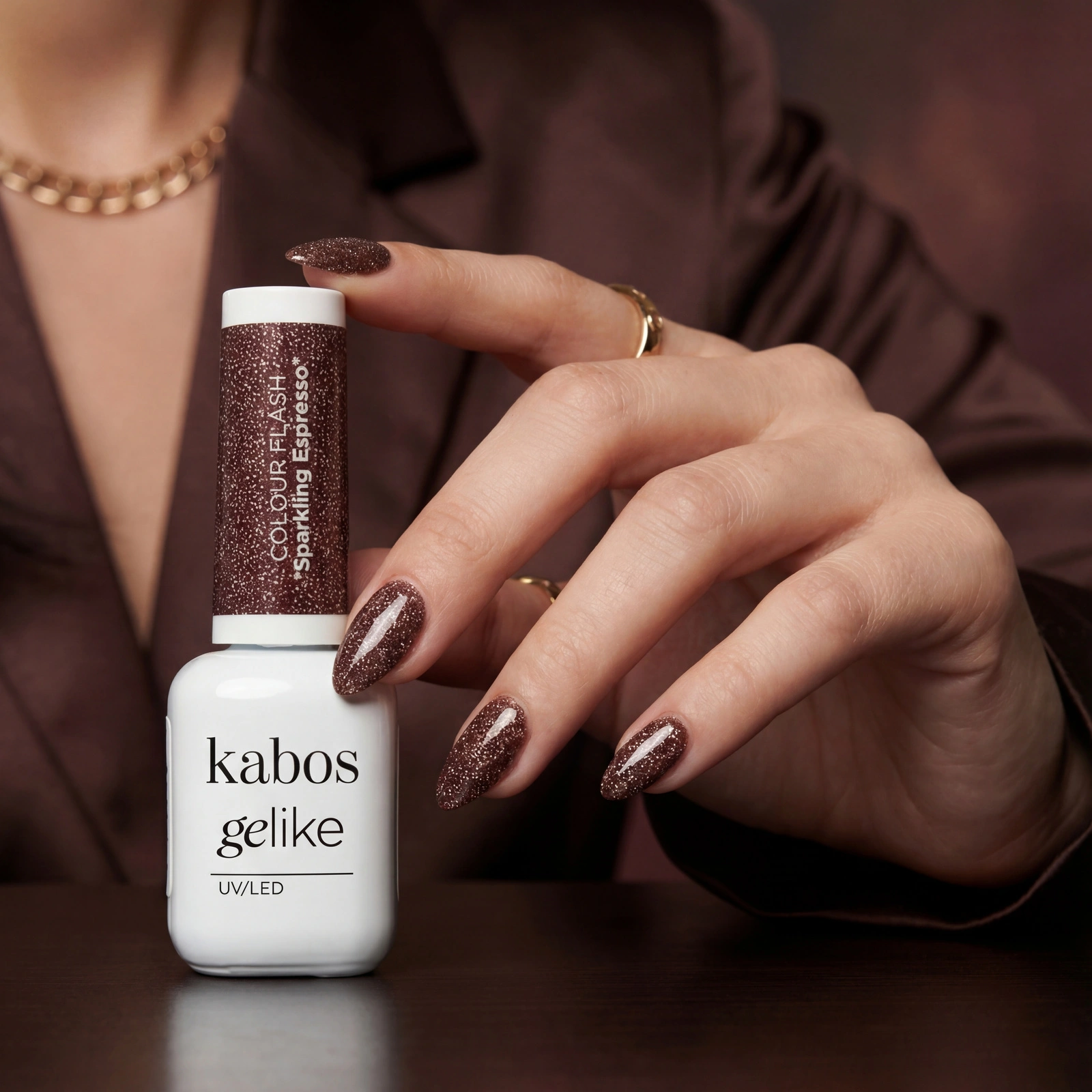Gelike Flash Sparkling Espresso łączy w sobie klasykę, głębię koloru i delikatny blask, tworząc stylizację, która wygląda świeżo, elegancko i wyjątkowo przez wiele dni.