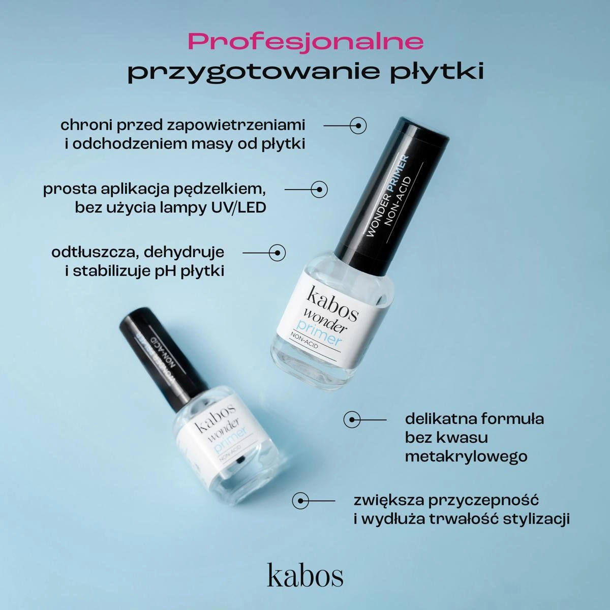 Primer do paznokci Kabos Wonder Primer to klucz do perfekcyjnej przyczepności i trwałości każdej stylizacji. Dzięki swojej formule primer bezkwasowy delikatnie odtłuszcza i dehydruje płytkę, jednocześnie wyrównując jej pH. To sprawia, że kolejne warstwy przylegają lepiej, a stylizacja jest odporniejsza na zapowietrzenia i odpryski. Aplikacja jest szybka i prosta, bo primer Kabos nakłada się cienką warstwą pędzelkiem, bez konieczności utwardzania w lampie UV/LED.