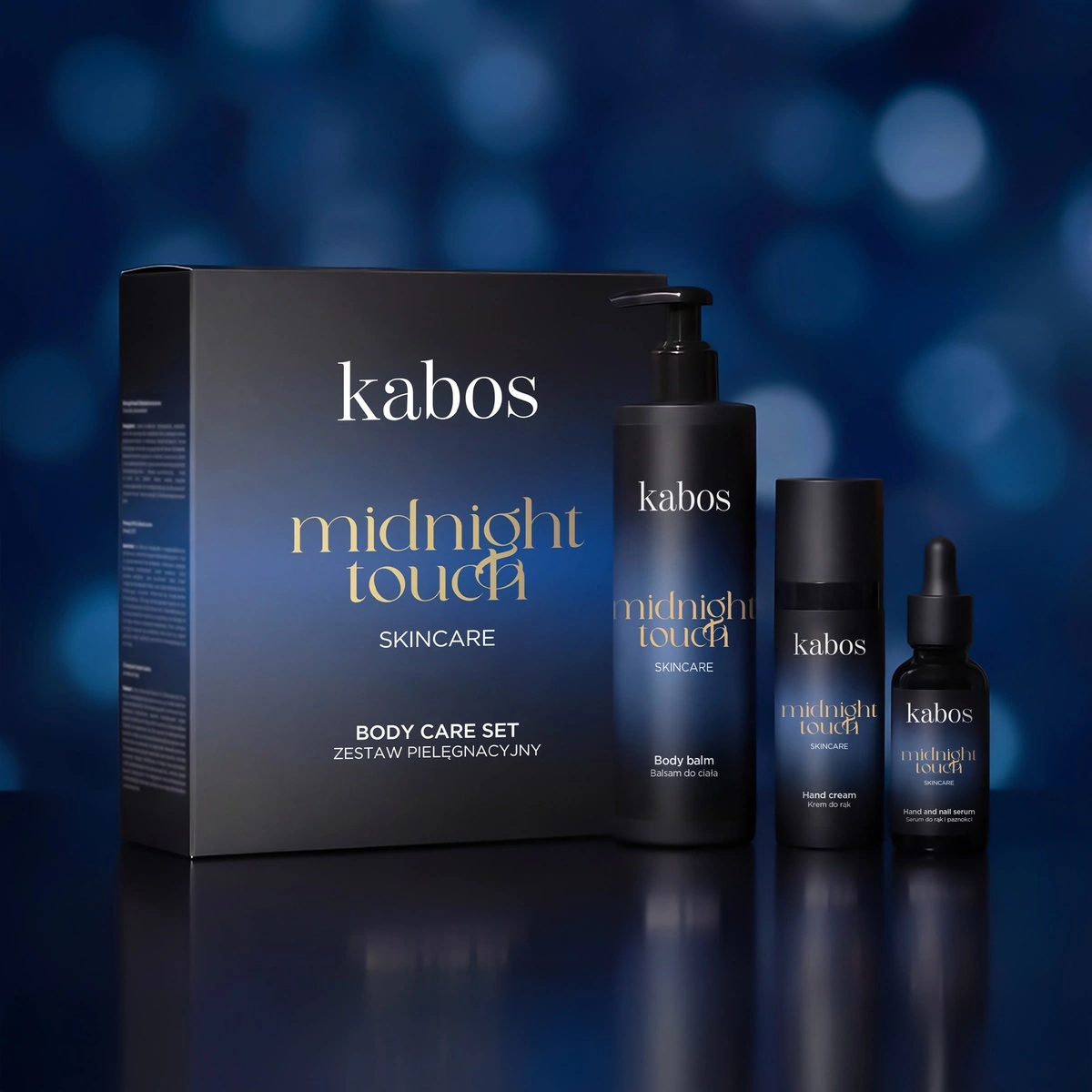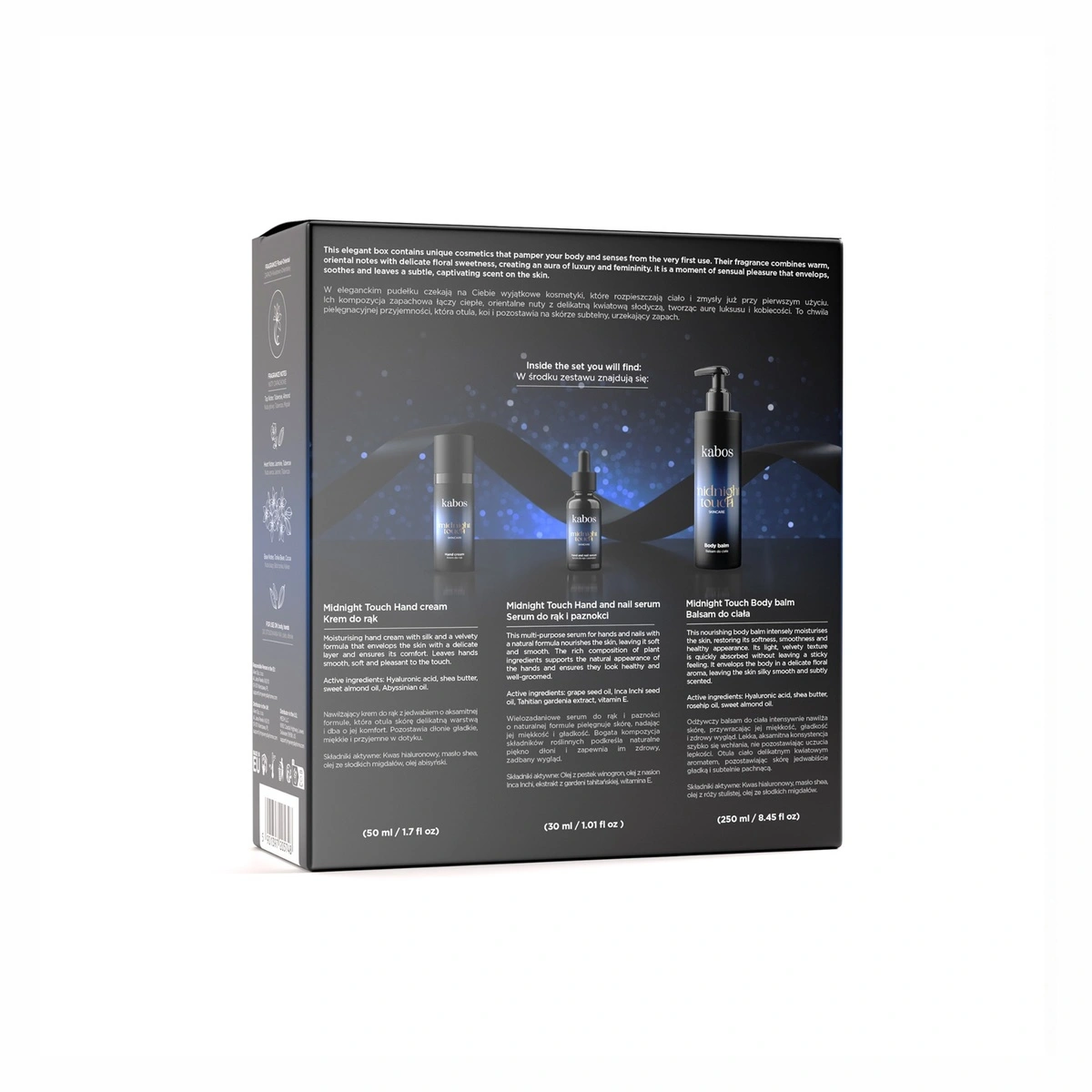 Zestaw do pielęgnacji ciała Kabos Midnight Touch to kompletny zestaw, który łączy działanie trzech wegańskich produktów: serum do skórek i paznokci, kremu do rąk oraz balsamu do ciała. Wszystkie kosmetyki mają jedwabiste konsystencje, intensywnie nawilżają i regenerują skórę, a przy tym otulają ją delikatnym, kwiatowo-orientalnym zapachem. To idealny zestaw dla osób, które chcą zadbać o skórę dłoni i ciała w sposób kompleksowy, skuteczny i przyjemny.
